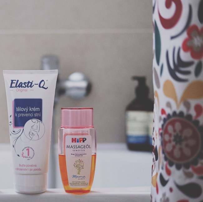 Mazat se, mazat se, mazat se. To se snažím dělat, abych neměla tělo samou strii, protože už dřív jsem k nim měla dispozice a na bocích se mi nějaké vytvořily za roky mého hubntí a přibírání. Vyzkoušela jsem několik přípravků a aktuálně používám dva. Každý večer se mažu olejem Bi-oil, který má strašně nepříjemnou a vlezlou vůni (prý hypoalergenní, ale stejně z toho kýchám), ale za to mám pocit, že nejlíp funguje, takže to přetrpím. Když nestíhám a potřebuju se namazat něčím, co se rychle vsákne a nemastí, používám krém E-lastiq. Ten voní příjemně, je oproti oleji super levný, ale není podle mě tak účinný, proto ho používám spíš výjimečně. Ještě jsem vyzkoušela Mama olej od Hippu. Ten moc hezky voní, jako miminko, ale zdá se mi, že se hůř vstřebává a není tolik účinný. Mazat doporučuju od krku až ke kolenům, né jen prsa a břicho. UPDATE: Jako další jsem vyzkoušela olej od Eucerynu a u toho zůstávám i do budoucna. Příjemně voní, dostatečně maže a celkově jsem s ním ze všeho, co jsem vyzkoušela nejspokojenější.