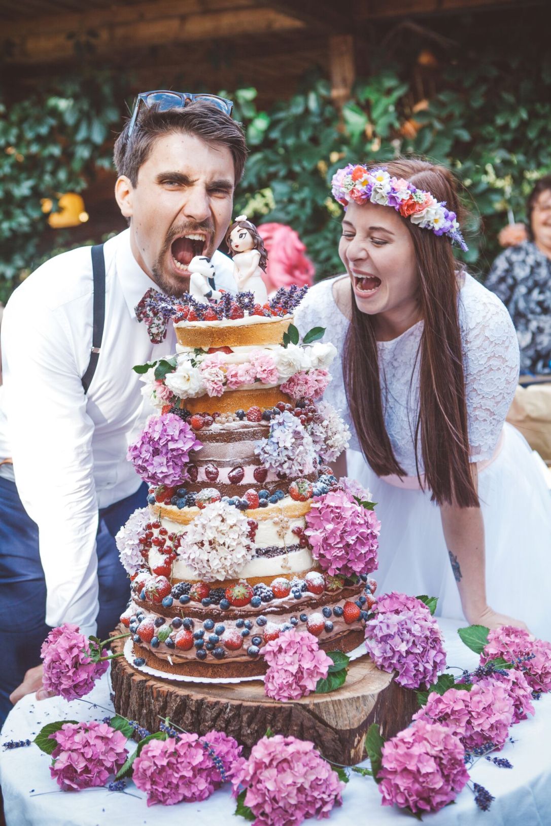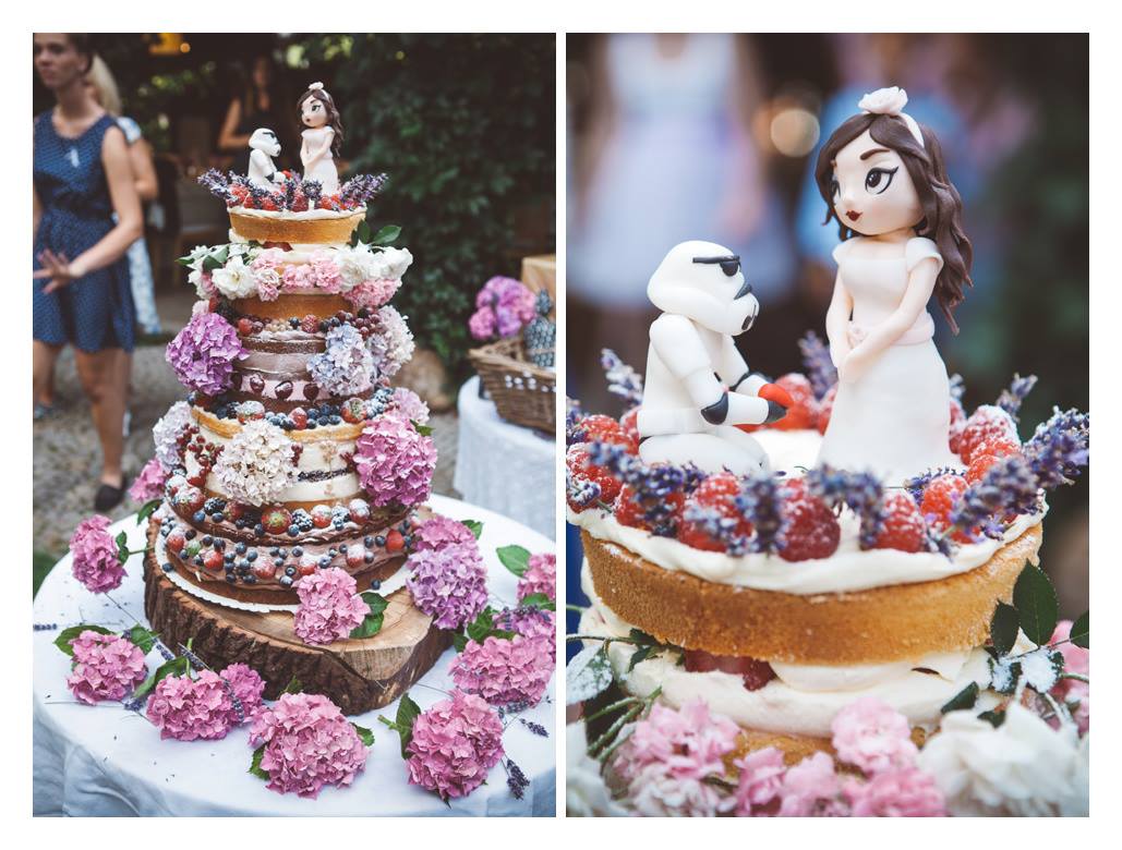 Svatební dort, to bylo obrovské svatební překvapení, které mě naprosto dojalo. Tak jako věnečky, dělali nám ho Petra s Tomášem z naší říčanské kavárny. Byl to pro nás svatební dar a my vůbec netušili, jak bude vypadat. Jen jsem Petře řekla, že by se mi líbil nahý dort a že já bych ráda čokoládový, ale Ondra vanilkový a tak že klidně ustoupím. Pak už jsem nic nevěděla, až najednou na svatbě přišel čas krájení dortu. Poslali nás do zahrady a zatím přinesli ten nejkrásnější, naprosto OBŘÍ dort. Kombinaci vanilky i čokolády, letní ovoce, zdobený květinami a na vrcholku Stormtrooper a já z marcipánu. Stál na nádherném kole dřeva, které pro tuto speciální příležitost vyrobil můj táta a bylo to celé naprosto dokonalé. Dort chutnal nebesky, stejně tak vypadal a bylo ho tolik, že jsme ho s ostatními ještě druhý den snídali.