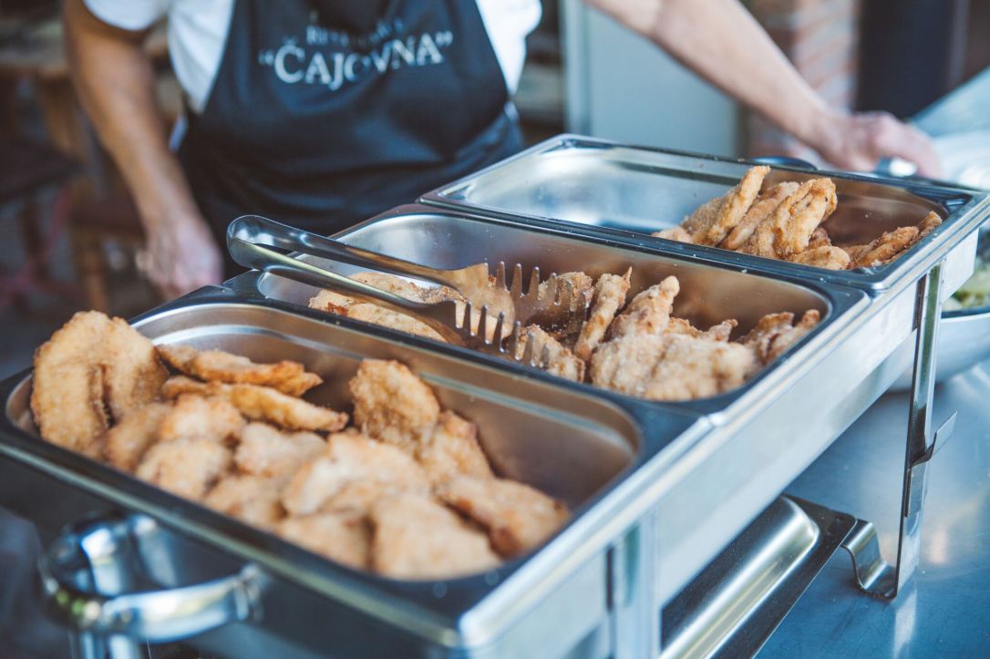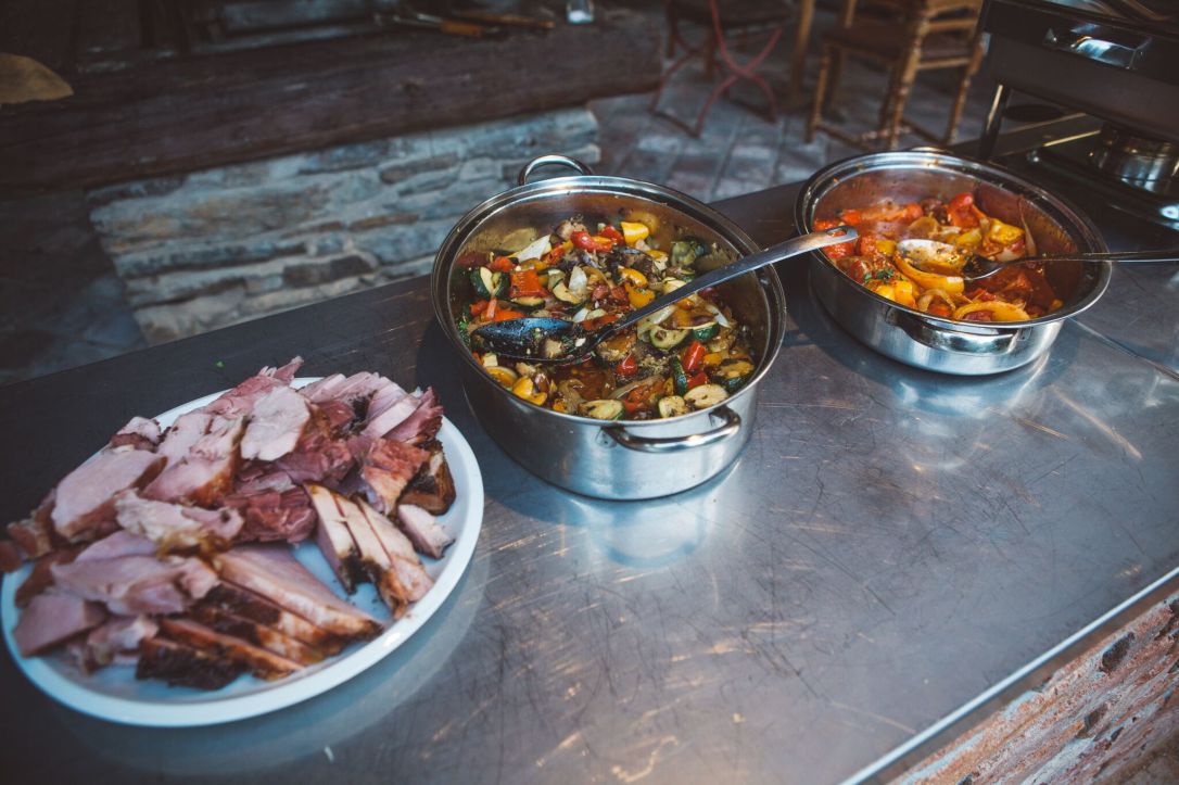Rozhodli jsme se pro formu rautu a grilování. Raut byl složený ze zeleninových a ovocných salátů, pečiva a dalších příloh, grilovaly se různé druhy masa a taky nesměla chybět hromada řízků. Grilovat se začalo kolem páté (obřad byl ve tři), ale jídlo bylo k dispozici po celý den a večer. Když jsme se před svatbou sešli s majitelkou restaurace a sdělili jí, kolik řízků bychom si představovali, kroutila halvou a říkala, že se to nemůže sníst. To ale neznala naší rodinu. Řízky byly pryč rychlostí blesku. A my věděli, že to tak bude, protože na každé oslavě rodiny z Ondrovy strany se vždycky sní tolik řízků, kolik se jich usmaží a nic by nezbylo snad ani ve chvíli, kdy by jich byl plný kamion. Grilování jsme navíc zahájili před naším focením a tak hosté byli zabaveni i ve chvíli, kdy jsme byli pryč. Před půlnocí se pak podával guláš.