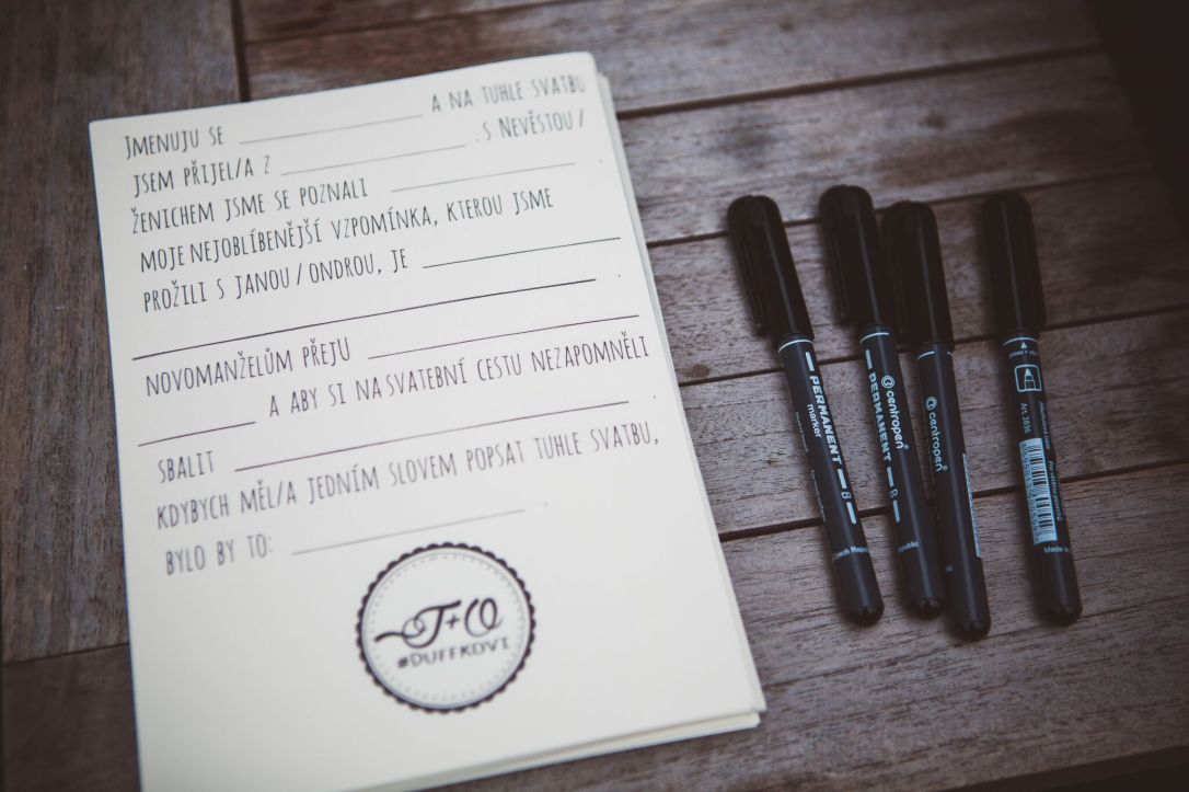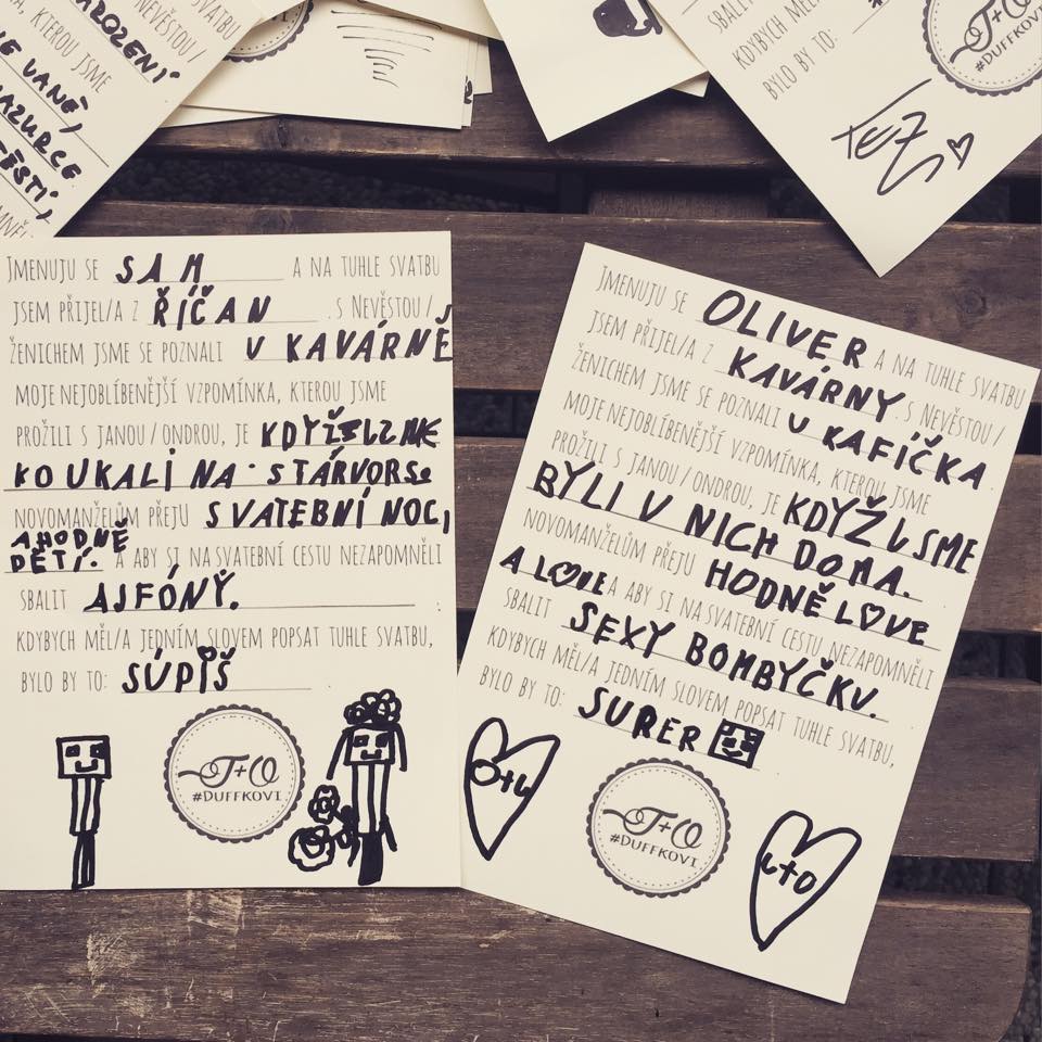K výrobě dotazníčků jsem se inspirovala na Pinterestu. Sedla jsem si k počítači a pomocí Canva.com jsem připravila dotazníčky, jaké můžete vidět na fotkách. Pak jsme je vytiskli na tvrdý papír a umístili je na další stolek spolu s fixami. Nechyběla černá krabice z IKEA, která sloužila jako schránka na vyplněné papíry. Na krabici jsme bílou fixou napsali návod, aby každý věděl, co má na tomto stanovišti dělat. Měli jsme radost, že se zapojili skoro všichni hosté a nám zůstala opravdu vtipná sada na památku. Nejvtipnější dotazníčky byly samozřejmě od dětí.
