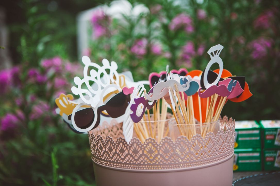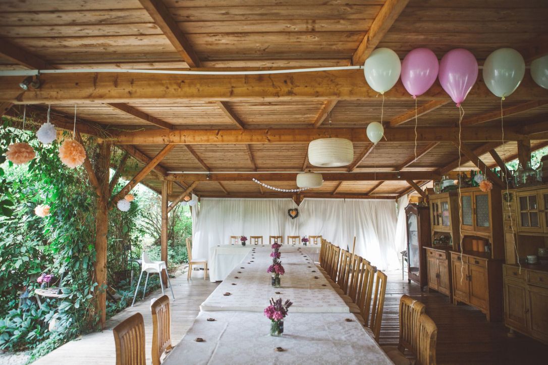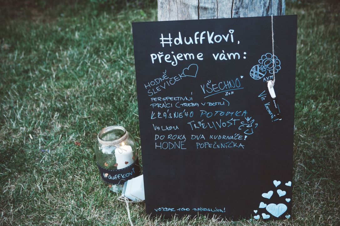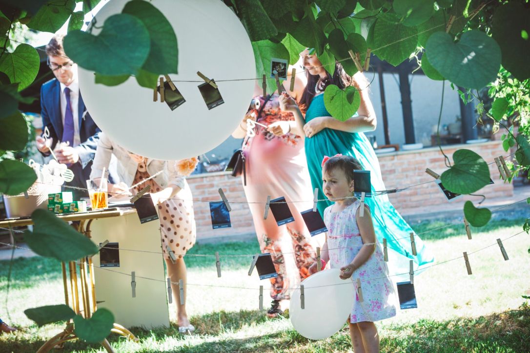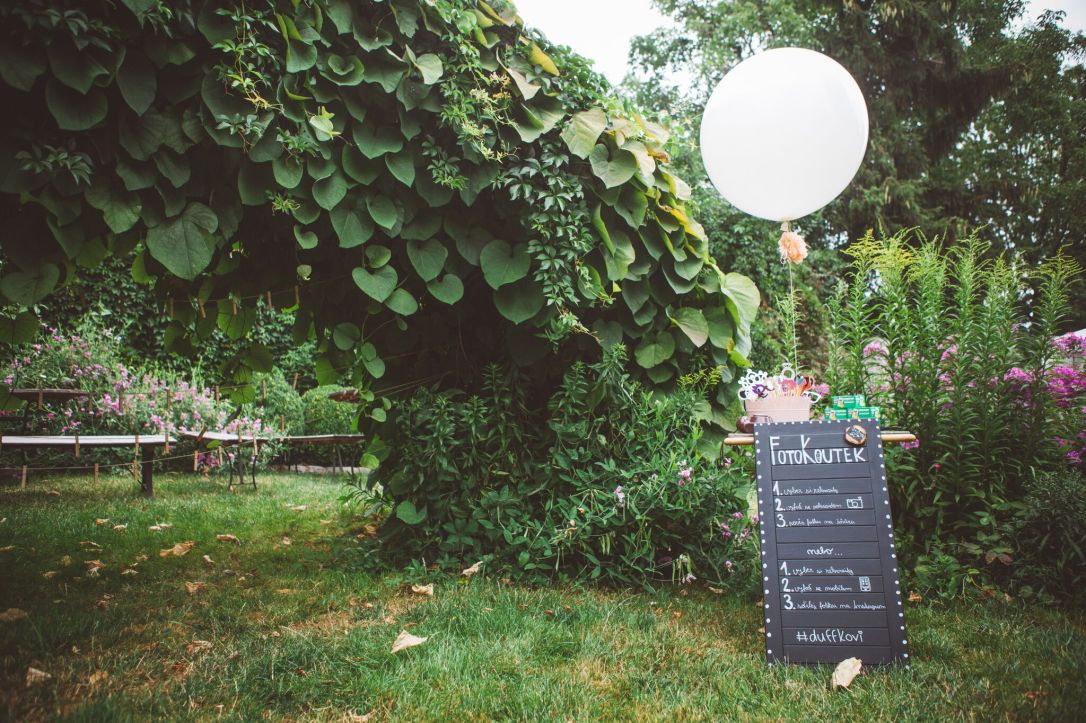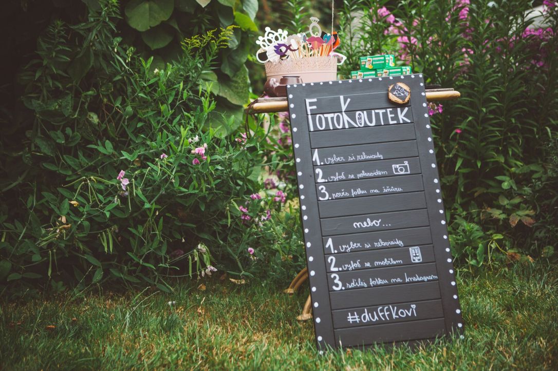 Fotokoutek na svatbě rozhodně nesměl chybět. Původně jsem měla představu o tom, že objednáme profesionální fotokoutek, například Smilebox, ale nakonec mi to připadalo jako zbytečně velký náklad a proto jsme si ho připravili sami. Na vhodné místo jsme umístili stolek a na něj položili 2 Instaxy (foťáky, které hned vytisknou fotku) – půjčili jsme si je v Polaroid Love, kde to funguje tak, že vám zdarma půjčí foťáky a vy si k nim koupíte náplně. Koupili jsme celkem 100 fotek a bohatě to stačilo. Na stolku byly kromě Instaxů ještě bublifuky a rekvizity na špejlích, které jsem objednala za pár dolarů na AliExpressu. Ondra vyrobil „komixové bubliny“ z kartonu a na ně si každý mohl napsat křídou, co chtěl. Vedle fotokoutku byly natažené šňůry jutového provázku s kolíčky, kam hosté mohli připnout svoje fotky, pokud nám je chtěli nechat na památku. Ani ve fotokoutku nechyběla cedule (více v článku o svatebních DIY) – tentokrát jsme ji použili jako „návod k použití“. Celkově jsme se tedy s cenou fotokoutku vešli cca do 2400 Kč, místo 10 – 20000.