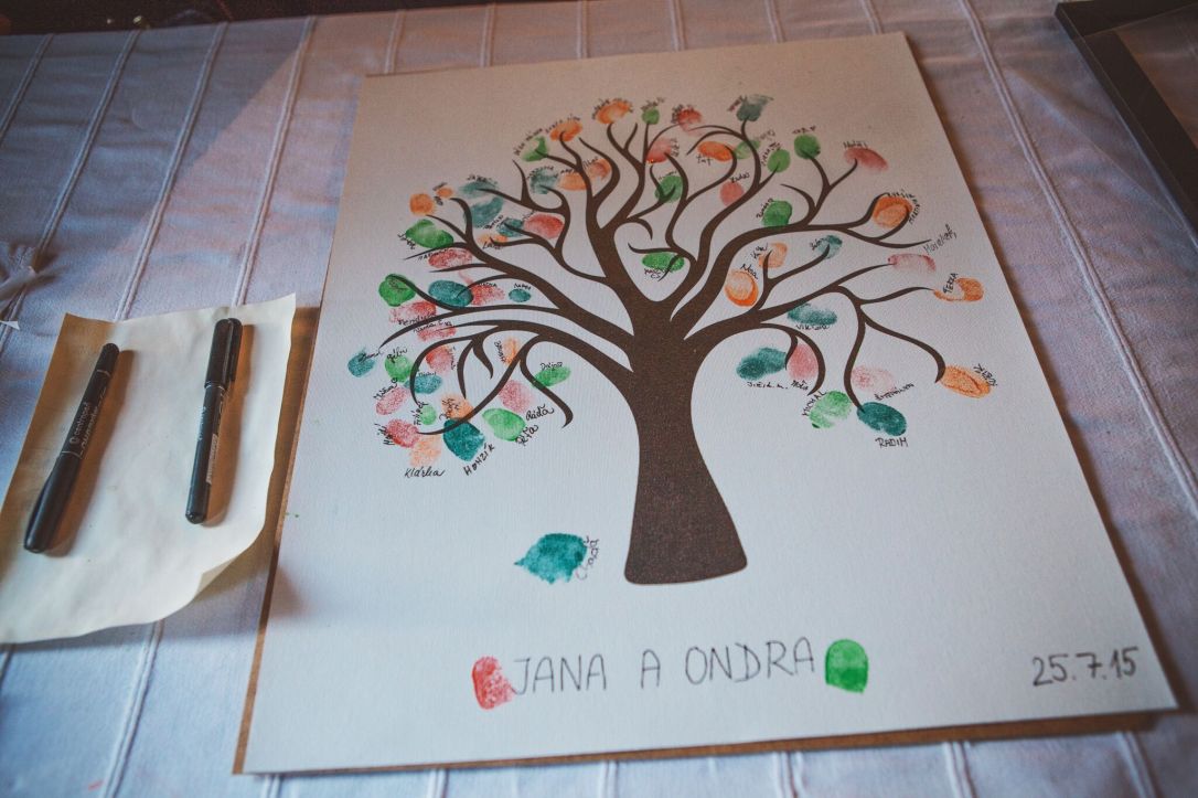 Strom hostů jsme dostali jako dárek od kamarádky – jedné z mých družiček a jejího muže. Je to obraz stromu, ke kterému patří houbičky napuštěné barvou. Každý host dá na strom svůj otisk prstu a připíše svoje jméno. Dnes máme strom v obýváku v rámečku a je to moc hezký svatební „suvenýr“.