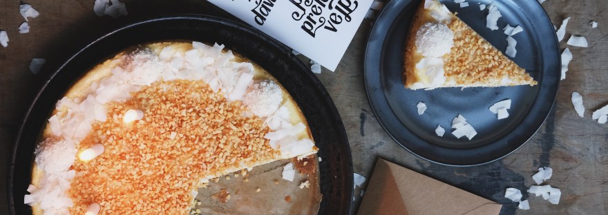 Dneska má Ondra narozeniny. Poslední ze série dvacet – něco. To si rozhodně zaslouží oslavit dortem, ne? Když jsem vymýšlela, co upeču, nedalo mi to ani moc práce, protože jsem si hned vzpomněla na kokosový cheesecake, nad kterým se rozplýval ve Zlíně. Do karet mi hrálo i to, že byl včera na vánočím večírku (nikdy nechápu ty vánoční večírky v listopadu, to je šílenství), takže jsme pekli s Tondou večer spolu. Čekala jsem návrat nad ránem, ale co se nestalo? Po jedenáctý už chrastily klíče v zámku! Ale nebojte, dobře to dopadlo, protože tou dobou už byl „šosake“ v lednici a čekal na okamžik překvapení.