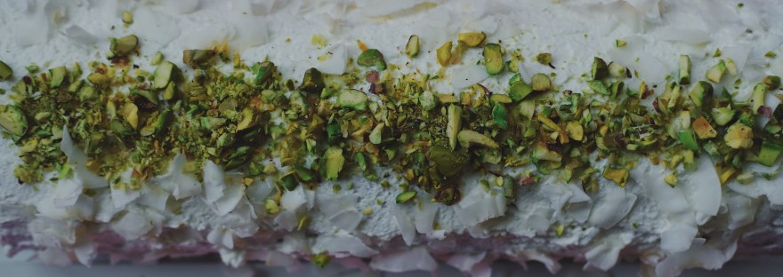 - Roládu zvenku potřete zbylou šlehačkou a posypte plátky kokosu a nasekanými pistáciemi.