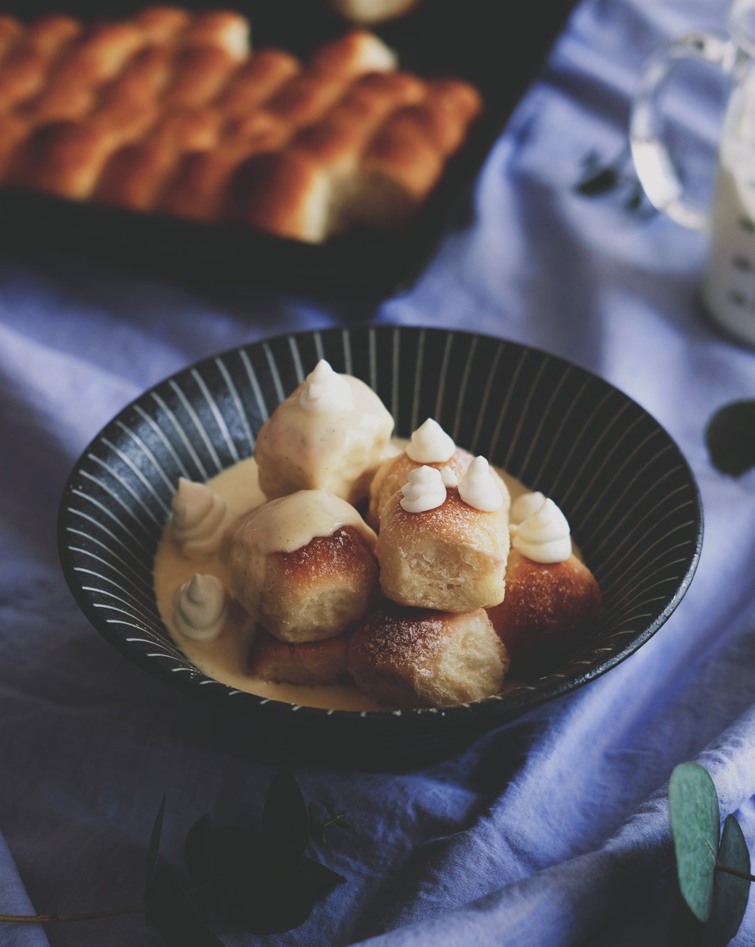 10. Než se buchtičky upečou, připravte si šodó. Mléko smíchejte se smetanou a vyškrábněte do něj vanilkový lusk. I prázdný lusk vhoďte do hrnce a vše přiveďte k varu. Poté odstavte a nechte vychladnout na pokojovou teplotu. Vyjměte slupku od lusku.