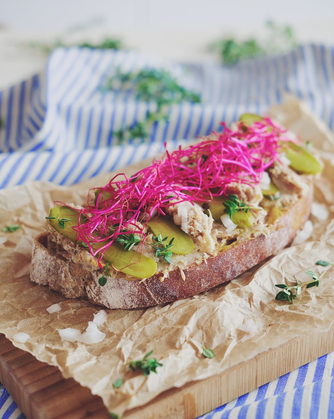 1. Plátek chleba natřete hořčicí a navrstvěte na něj štědrou porci rillettu.
