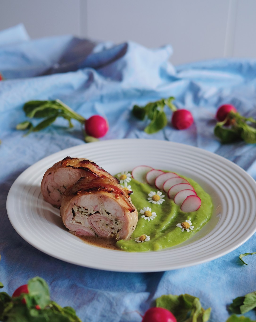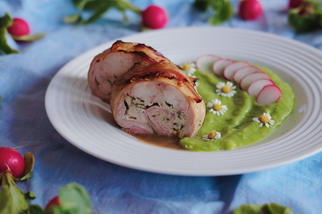 Brzy budou Velikonoce a tak tady mám další barevný recept. Tentokrát je to králičí roláda, kterou rozzáří rozkvetlá louka…teda hráškovo-bramborové pyré. Co se týká jedlých květů, já na fotce měla heřmánek, ale nejradši bych použila sedmikrásky. Škoda, že ještě nekvetou! Vzpomínám si, jak prababička chodila po zahradě a každou chvíli se pro jednu sehla a šoupla ji do pusy. Myslím, že říkala, že prodlužují život – a asi to fungovalo, protože se dožila hodně vysokého věku.