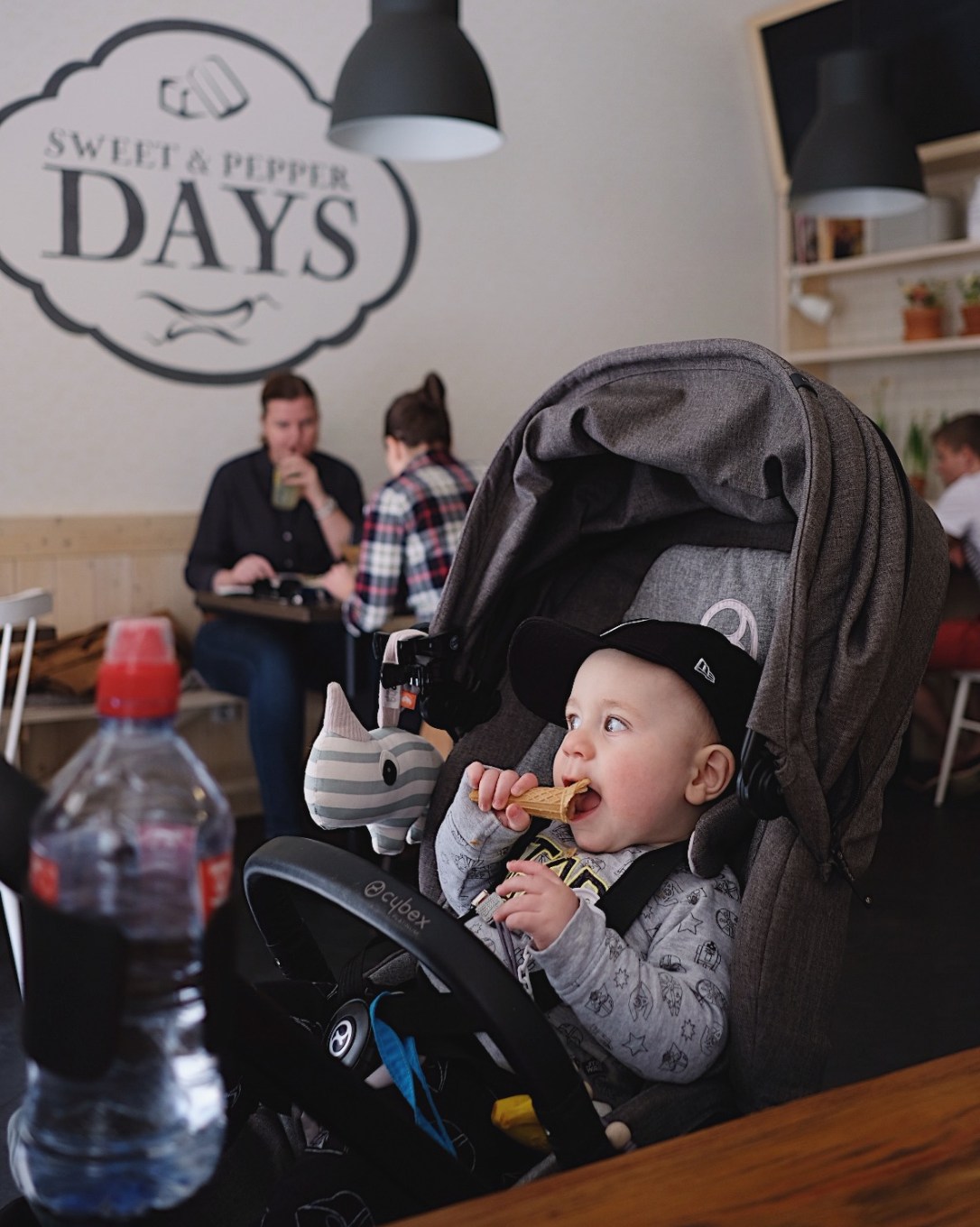 Po krabovi jsme se šli osvěžit zmrzlinou do blízkého Zmrzlináře. Tady si pochutnáte na poctivé zmrzlině 2AD. Ta se jeden čas vyšplhala v Praze jako „mega hit“, ale my na ní jezdili do Tuchlovic ještě, než to bylo cool. Co si pamatuju, pak se objevila v Mém šálku kávy v Karlíně a potom tak nějak všude možně, až se otevřel Zmrzlinář. Vypadá to tam krásně, ale protože znám 2AD tak, jak vypadala v krámku na té „vesničce“, kde lidi stáli obrovskou frontu a sympatická paní nám ji nabírala do termosky, aby nám zmrzlina vydržela až domů na zahradu, přišlo mi to tady takové nějaké smutné, i zmrzka ve vitríně byla tak úplně obyčejně, ale kvalita i chuť zůstala, to jo, a na tu se tady vyplatí zastavit. Já měla příchuť hořký karamel a Ondra si dal višňovou. Ale pozor! Ani Tonda nezůstal o hladu. Zažil tady svojí kornoutkovou premiéru a moc se mu líbilo nadrolit si drobky do kočáru.