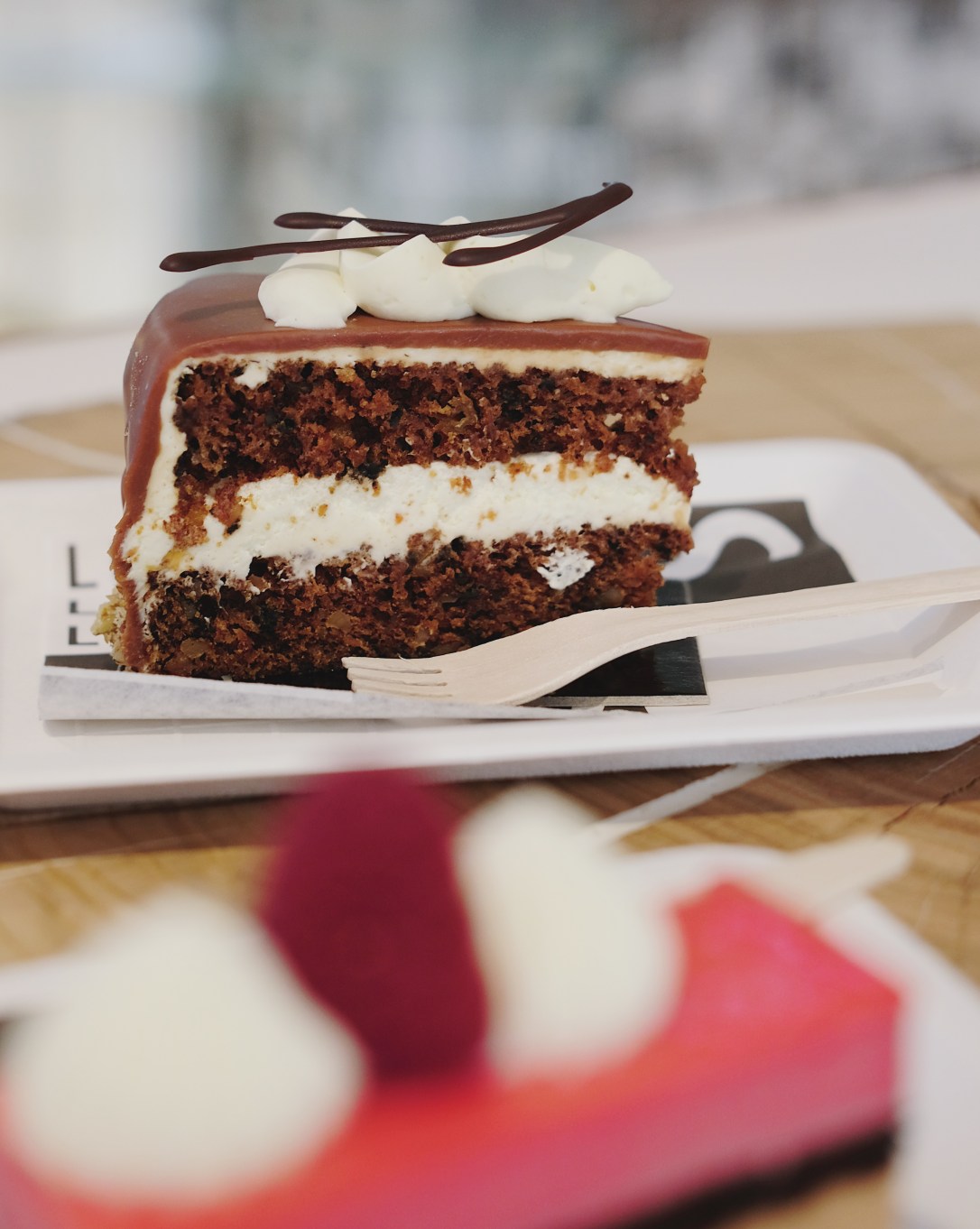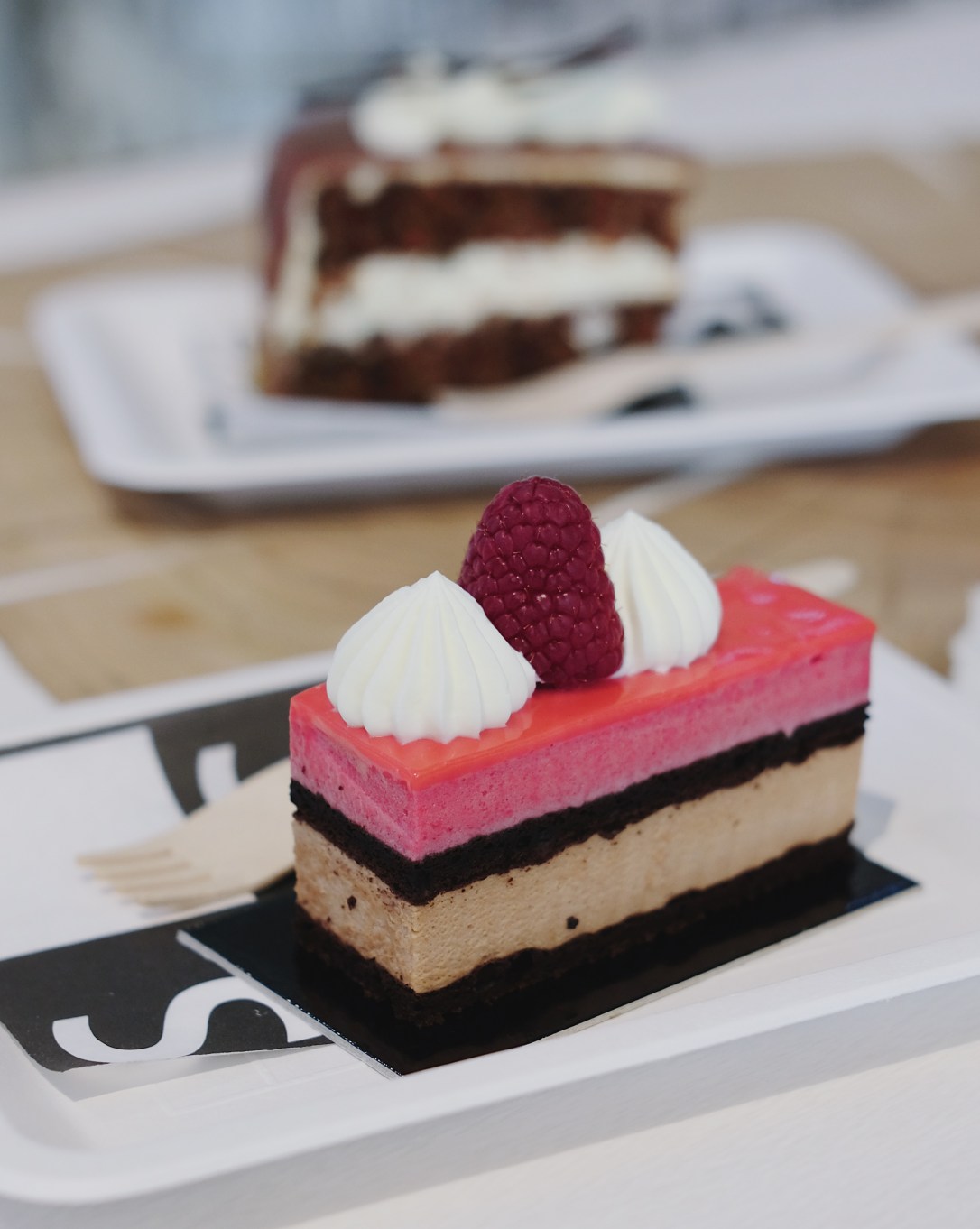 Z obchůdku to bylo už jen pár kroků ke Skálovi na něco sladkého. Já poprvé dezerty z této „cukrárny“ ochutnala už včera (a dříve vlastně v Bruxxu ), protože mi je Ondra s Tondou vzali domů z procházky, ale rozhodně mi to nestačilo. Tohle je přesně to místo, kde každý dezert vypadá jako precizní umělecké dílo. Seženete klasiké české dorty (některé hodně moderně pojaté, např. žloutkový řez), ale i méně tradiční, nejrůznějších barev, tvarů i chutí. Myslím, že ať sáhnete po jakémkoliv dezertu, neuděláte chybu. Ondra měl mrkvový dort a já bezlepkový malinový. Maliňák byl perfektní, jediné co mi chybělo, byla ještě nějaká struktura navíc. Byl měkoučký a hlaďoučký a kdyby uvnitř byla nějaká křupinka, budu v sedmém nebi. Možná jsem ji tam tak nějak očekávala hlavně proto, že si pana Skálu pamatuju z přednášky na Culinary Symposiu, kde předváděl svoji práci a povídal o tom, že do svých dezertů vždy kombinuje protiklady – měkké a křupavé, horké a studené, hořké a sladké…tak jsem si to asi nějak podvědomě propojila. Obsluha parádní a nádherný interiér. A venku se dá posedět na zahrádce.