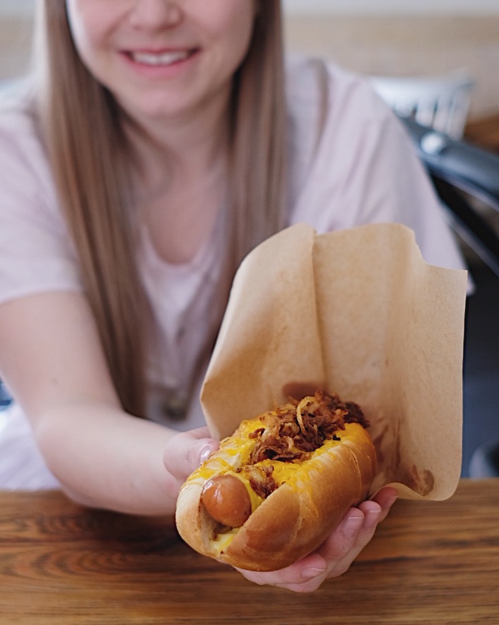 Jako další jsme si udělali rychlou zastávku v Anglické, protože měl Ondra chuť na hot dog a sem vždycky na hot dogy chodil s kolegy z práce, když ještě pracoval v agentuře. Objednal nám Cheddar hotdog, takže už víte, že byl se sýrem a pak ještě se smaženou cibulkou. Já moc nemám rád hořčici a vlastně nejsem ani velký fanda zlatavé cibulky, takže jsem jen ochutnala a většinu si dal Ondra, který si na hot dogu opravdu pochutnal. V nabídce mají i slidery, různé falafely, hummusy, saláty, sandwiche – zkrátka vybere si tu snad opravdu každý. Prostředí je moc příjemné a v létě mají zahrádku. Tu si pamatuju, protože jsme kolem ní vždycky chodili zase my z naší agentury, když jsme mířili do sousední vietnamské.