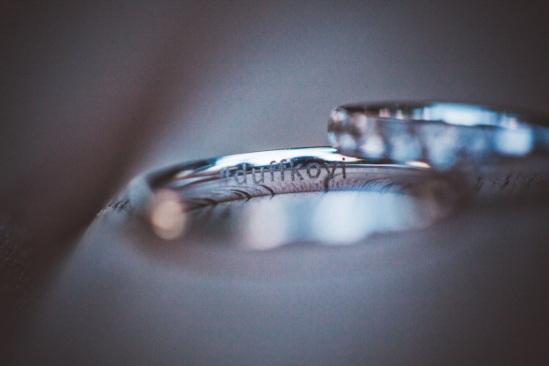 Ke konci objednávky nám položili dotaz, co chceme do prstýnků vyrýt. Protože naše svatba nebyla tradiční, nechtěli jsme ani tradiční nápisy jako „Jana 2015“ nebo „Miluju tě, Ondra“ a tak dále. Takže jsme si objednali „#DUFFKOVI“, což skvěle vystihlo nás, online postižence a taky naší svatbu, kde lidi tenhle hashtag používali pro sdílení všeho, co tam zažili. To nám přineslo vtipnej závěr naší objednávky u Rýdla, kdy následovala reakce prodavačky: