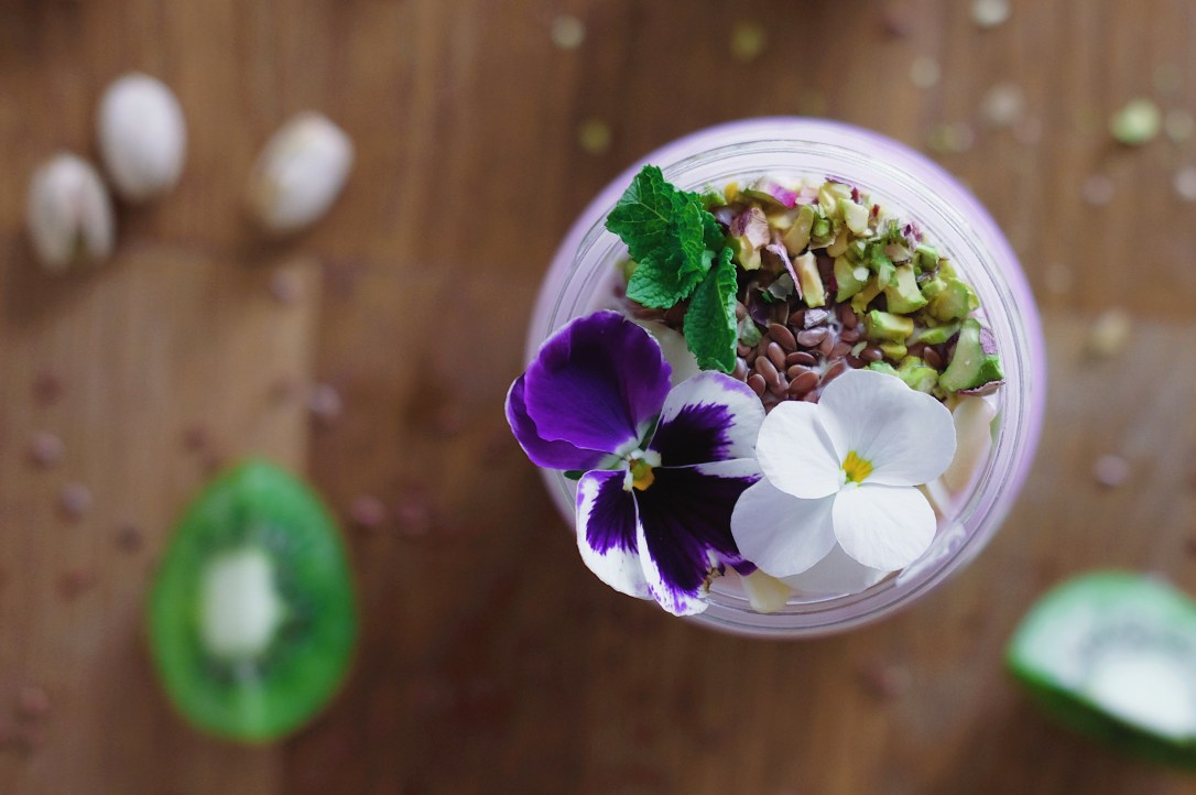 - Vršek jogurtu ozdobte zbylými oříšky, semínky, mátou a případně jedlými květy.