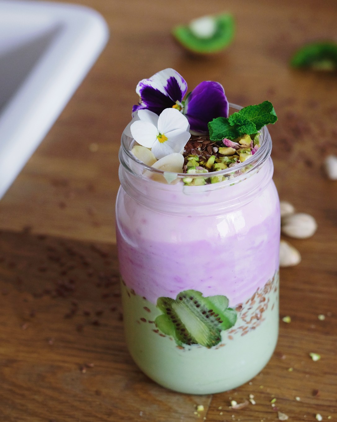 - Povrch zeleného jogurtu posypte lněným semínkem a opatrně nalijte fialovou část.