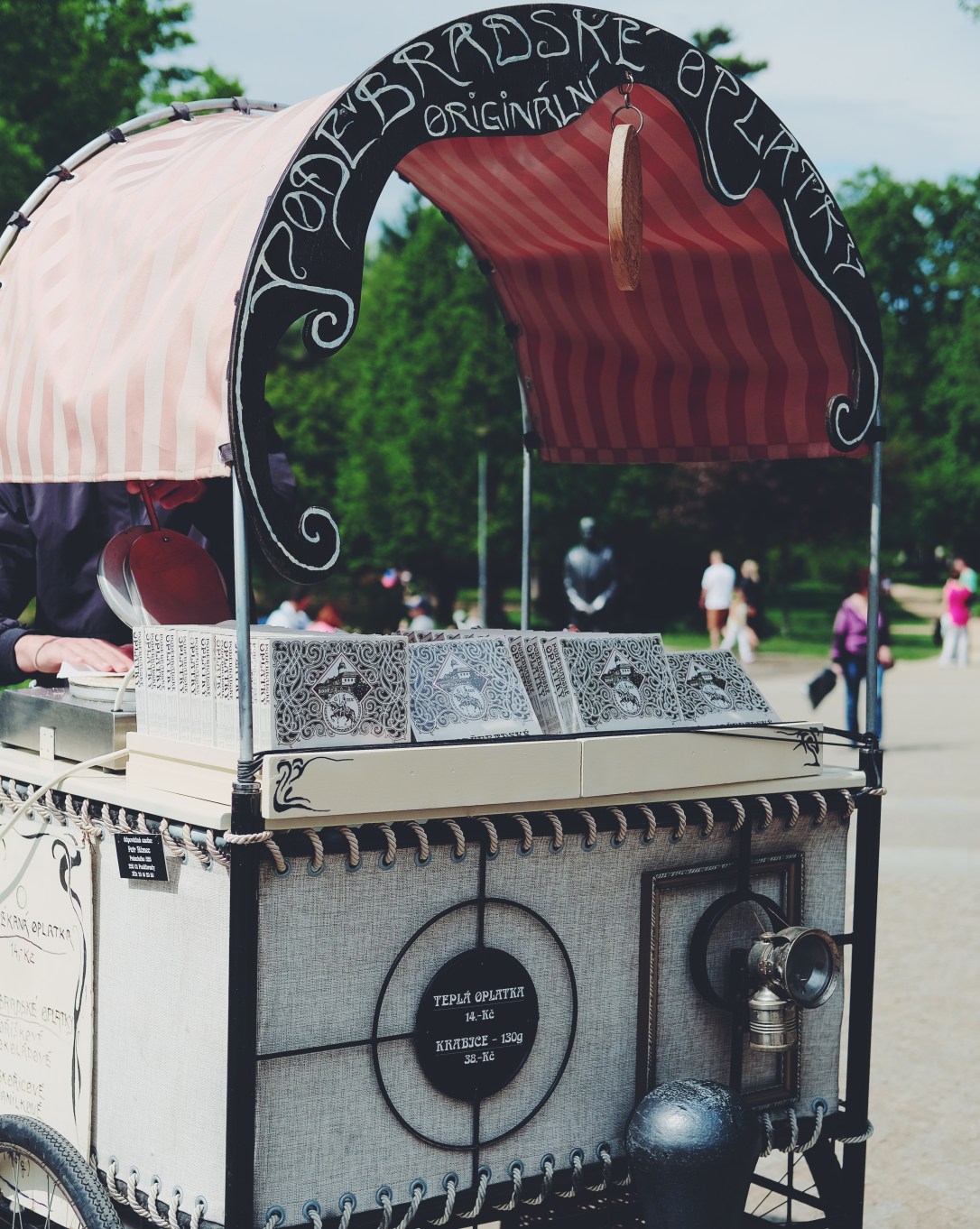 Jdeme uličkami Poděbrad a míjíme fakt pěknou sýrarnu. Škoda, že je svátek a má zavřeno, jinak bych tam určitě vlítla. A o pár kroků dál začíná slavná kolonáda. Hned si kupujeme teplou oplatku – ne jednu, ale všechny. Od každé příchutě jednu: oříšek, skořici, čokoládu i vanilku. A aby řeč nestála, Petr hází minci do vedle stojícího „cirkusu“ a pouští ná Poděbradskou hymnu. Vyhrne se opona, „cirkus“ zpívá a jezdí v něm figurky. Především děti tím určitě potěšíte.