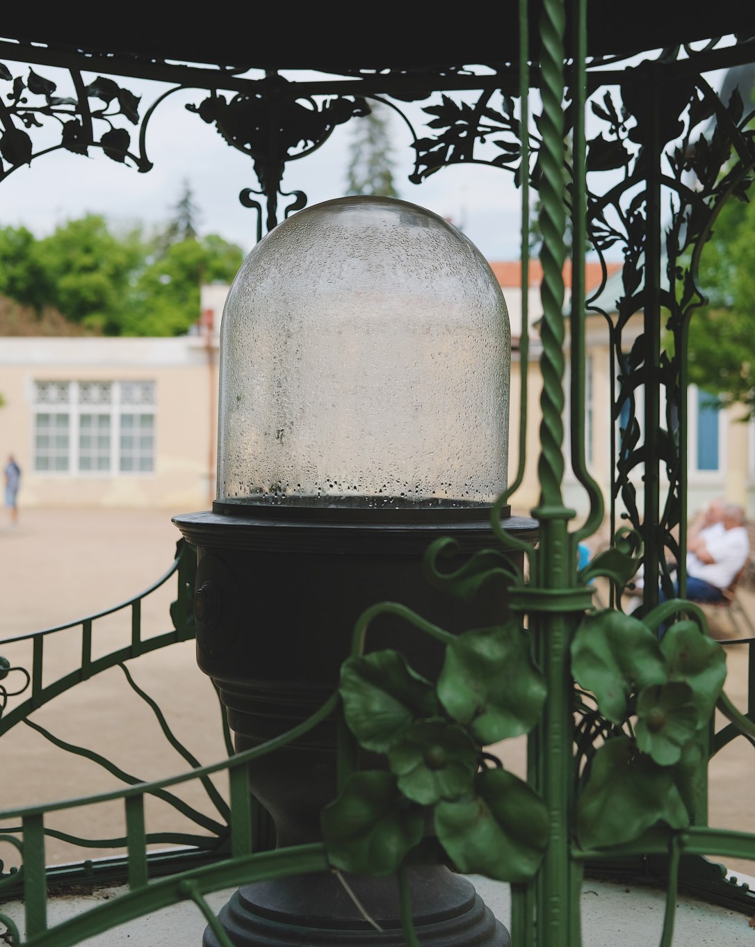 Přes poslední část kolonády, která je krytá a je v ní výstava fotek, se dostáváme k pramenu Boček. Hned si kupujeme kelímek a jdeme ochutnat. Dlouho u něj ale nevydržíme, protože nás to táhne k nádherně modré fontáně. A nejsme sami, fotí se tu úplně všichni. Vzadu za fontánou, za stromy, je budova nádraží, která byla postavena do tvaru lokomotivy. To ale většinou nepoznáte, protože je schovaná za stromy.