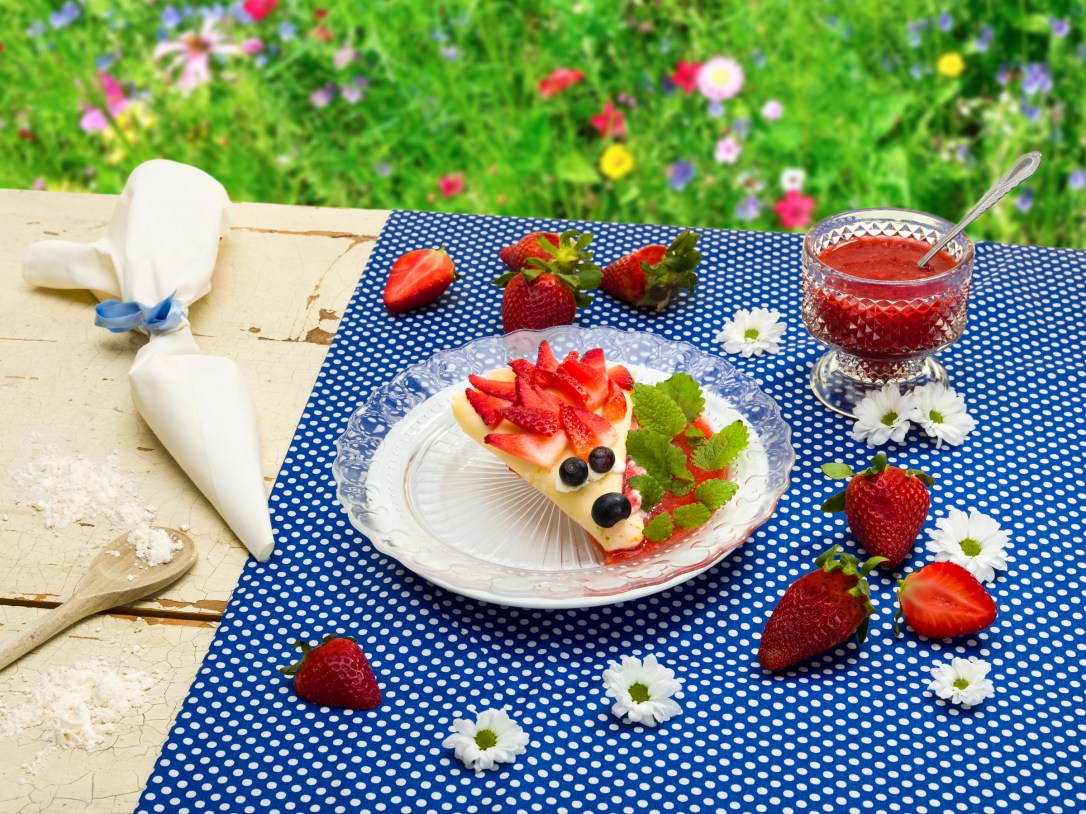 - Pomocí čerstvého ovoce a zakysané smetany dozdobte do tvaru ježka a podávejte se studenou jahodovou polevou ozdobenou čerstvou mátou.