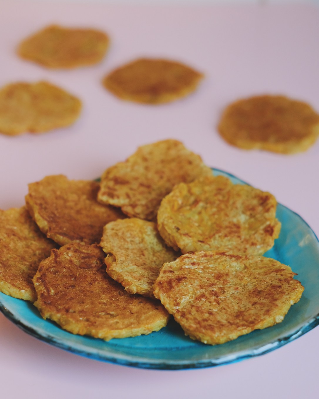 - Rozehřejte pánev na střední výkon sporáku a lžící na ni z těsta utvořte stejně velká, několik milimetrů silná kolečka. Pomalu je opékejte a až bude vše držet pohromadě a spodní strana začne zlátnout, pomocí obracečky placičku otočte a opečte i z druhé strany. Já placičky propékala pomalu a opravdu několik minut, aby se stihly batáty dobře propéct.