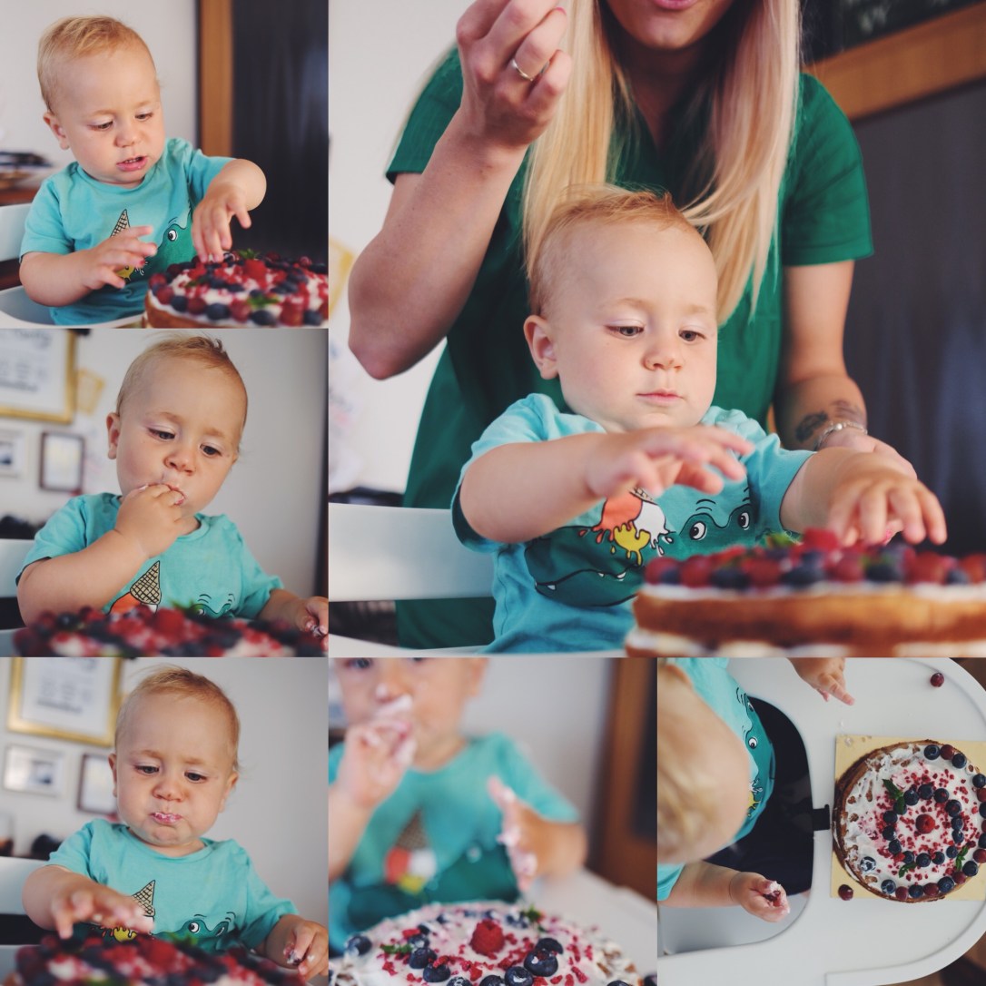 A co vlastně Toník na dort říkal? Samozřejmě ho nejvíc zaujala svíčka, kterou jsem radši hned zhasla, abysme místo mlsání neřešili spálený prstíčky. To mu ale nevadilo, protože pak objevil ovoce, kterým jsem dort ozdobila a nadšeně se do něj pustil. Samozřejmě až po tom, co jsme ho spolu s dortem usadili do židličky. Kdyby ho degustoval na koberci, kde byl zrovna když jsem s dortem přišla, asi by mi připravil úklidovou zábavu na celé odpoledne :D
