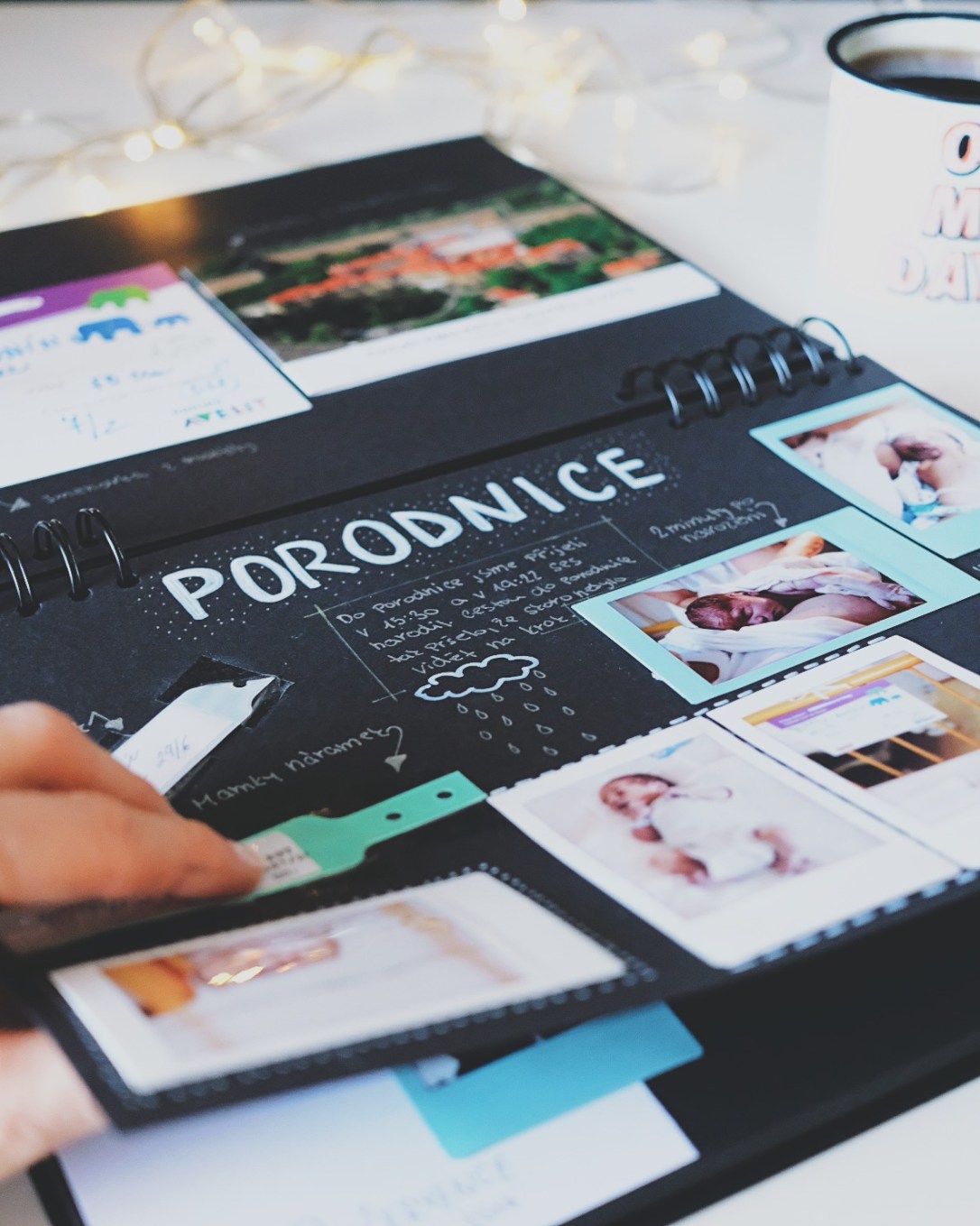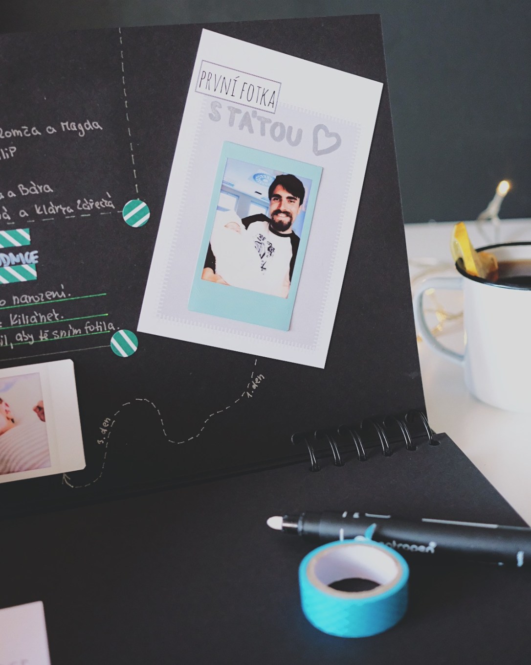 Na takový deník se nejvíc hodí blok s tvrdšími papíry, takže třeba takové to fotoalbum na nalepování fotek. Věřte, že i když budete hodně psát a jen občas přidáte fotku, nebo jinou vzpomínku, papír musí být silnější, aby to hezky drželo pohromadě, až v tom budete třeba i za 30 let listovat (a budou vám na ty stránky kapat slzy dojetí). Rozhodně dejte přednost kroužkové vazbě – se zhmotněnými vzpomínkami nabydou stránky na objemu a jedině na kroužkách to bude dobře fungovat. K zahození nejsou ani pořádně tvrdé desky, které unesou nejen váhu papíru, ale i roky v domácí knihovně a putování z ruky do ruky (prvních a dalších holek nebo kluků vašeho potomka). Barva papíru? Ta je na vás, ale já vybrala černou, protože miluju bílou fixu na černém papíru. To je prostě už takový můj styl. Pokud se ptáte, kde přesně jsem blok koupila, tak v Papírně, ale už je to nějaký ten rok zpátky. Dlouho nám ležel doma a neměli jsme pro něj využití. Velikosí je to A4 a tento rozměr se mi zdá pro tento účel nejpraktičtější.