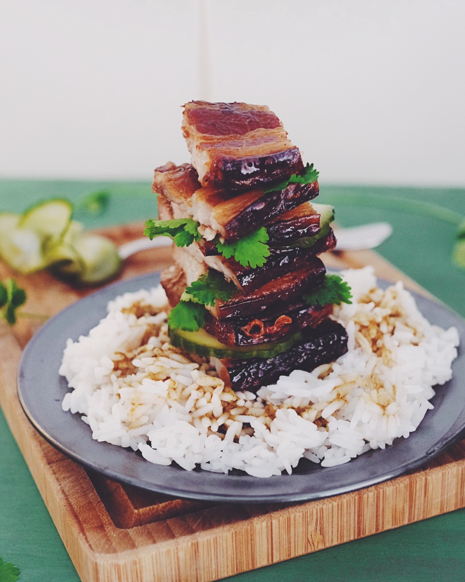 Nejlepší je udělat si bao knedlíčky, nakrájet bůček na malé čtverečky a podávat ho v bao knedlíčku spolu s omáčkou, čerstvým koriandrem, opraženým sezamem a čerstvými kyselými okurkami. My ale teď nejíme tu mouku, tak jsme to jedli s jasmínovou rýží. Každopádně i tak vám sem recept na čínské bao dám, protože jsem ho dělala před pár lety a bylo to boží.