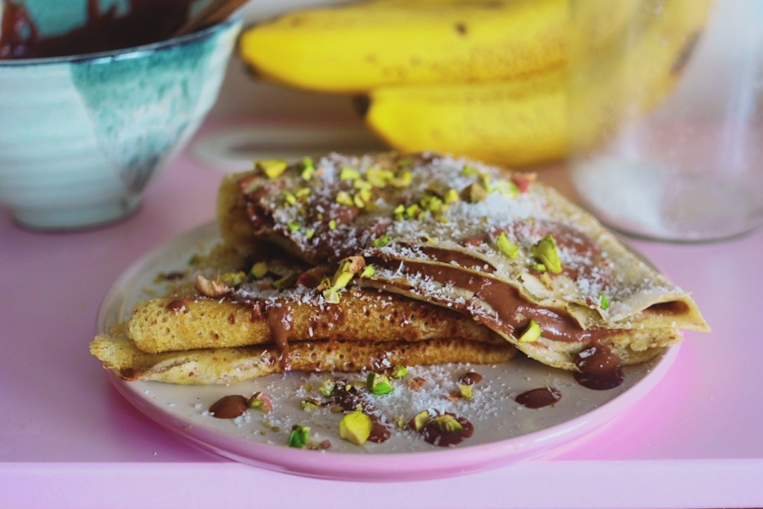 Dneska ráno jsem dostala chuť na palačinky s Nutellou. Takže jsem si je šla udělat po svém, aby zůstaly bez cukru a mouky a byly pěkně ze základních potravin. Chystala jsem se dělat rýžové palačinky, ale až když jsem to všechno házela do mixéru, přišlo překvápko. Málo rýžové mouky. Takže jsem prohrabala kuchyň a nakonec jsem omylem dala dohromady tenhle recept a byla to fakt dobrota. Včetně “čokoládový” náplně.