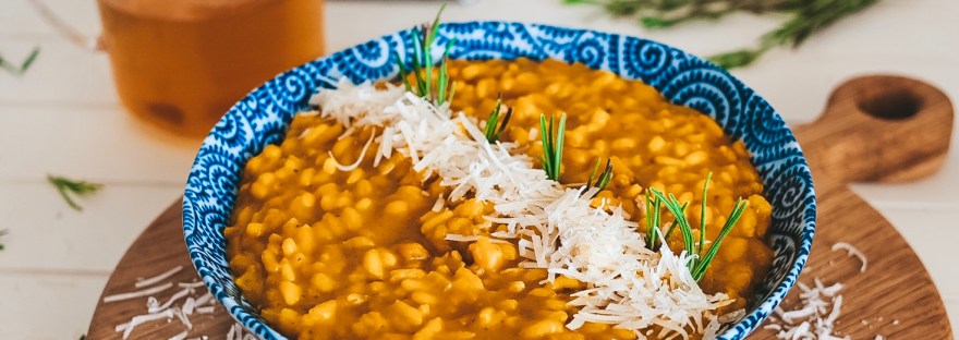 Dýňový risotto je taková dobrota! A nejlepší je, že je v něm ta dýně, takže „tajně“ propašovaná zelenina a Tondovi to strašně chutná. Sice by normálně dýni nechtěl, ale ještě je ve věku, kdy mu prostě oznámím „rejži s omáčkou“ a on sní dva talíře :D S Ondrou je to horší, ten dýni nemá rád a už mu ji jako omáčku neprodám. Neva. Aspoň zbyde víc pro mě.