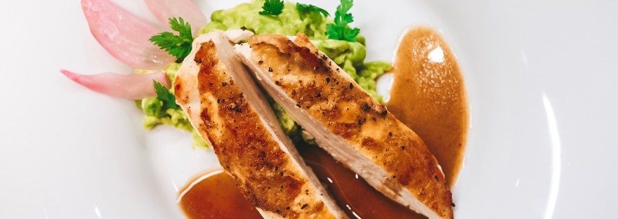 Kuřecí prsíčka s omáčkou z cideru, šťouchaným hráškem a nakládanými šalotkami