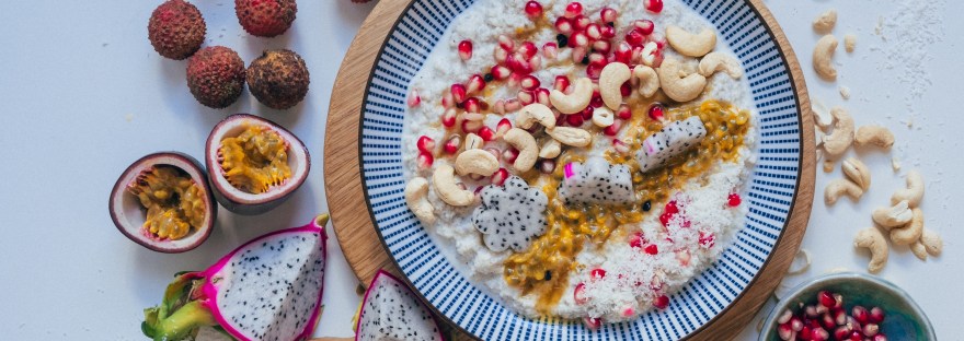 Tahle snídaňová kaše je strašně jednoduchá. Stačí na ní vlastně jen pár ingrediencí a postup je tak rychlý, že to člověka třeba ráno před prací skoro nezdrží. Nejlíp chutná s výraznějším, ideálně i kyselým ovocem – taková maracuja, nebo mango, to je ideální! Na fotkách vidíte, že jsem porci doplnila nejrůznějšími druhy exotického ovoce – je tam už zmíněná maracuja, ale taky dragon fruit, granátové jablko a liči. Když si doma chceme pochutnat na exotickém ovoci, objednáváme ho na Košíku – a to jsme dělali už dávno před tím, než jsem s Košíkem začala spolupracovat. Nebude to špatný ale ani s něčím dostupnějším – dokážu si představit v hlavní roli třeba i pomernače, nebo borůvky.